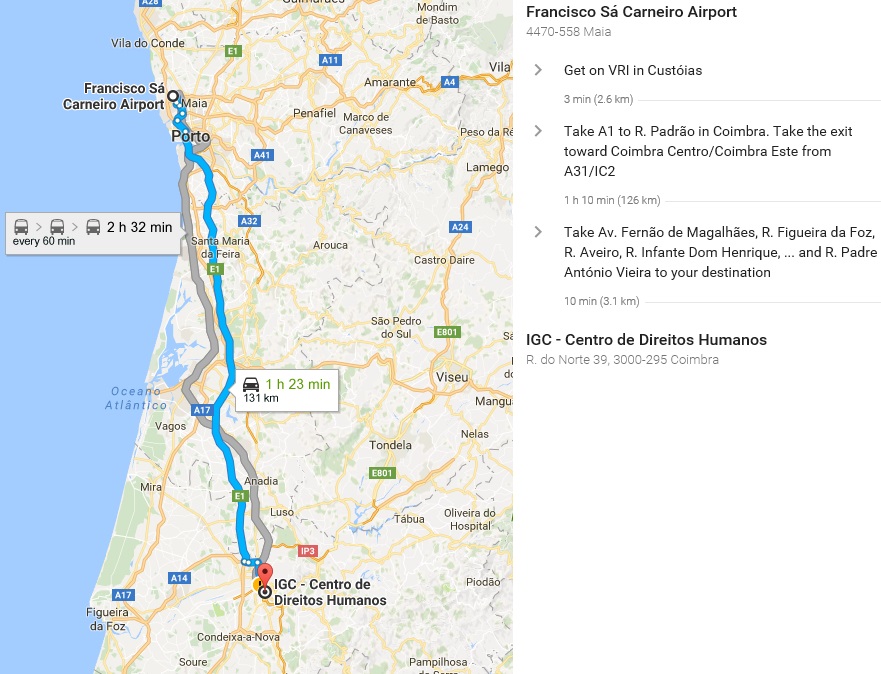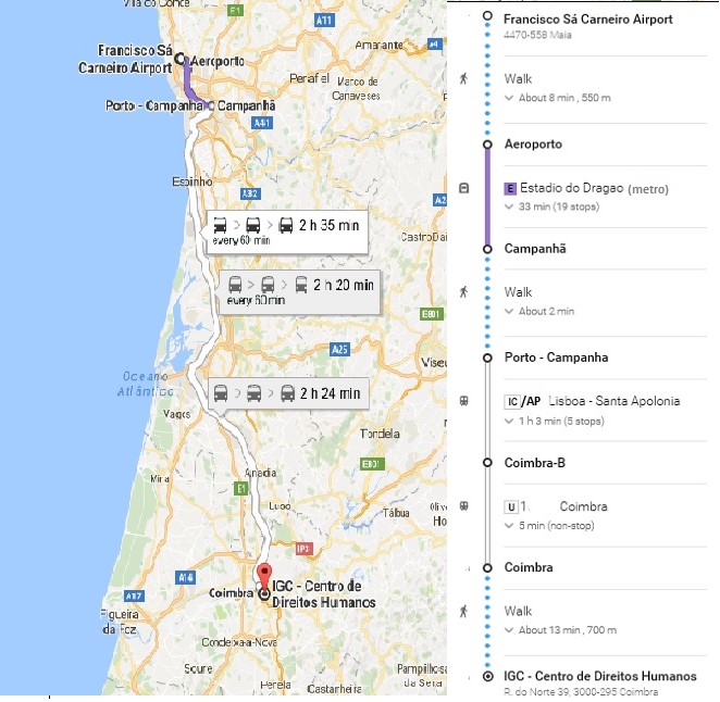 Taxi, metro (linha roxa: do aeroporto - Estádio do Dragão, sair em “Bolhão”, 10 minutos de caminhada) ou autocarro (autocarro do aeroporto até ao terminal rodoviário do Atlântico, com a morada: Rua Alexandre Herculano, 366, Porto). Autocarro do terminal rodoviário do Atlântico até ao terminal rodoviário de Coimbra. Preços aproximados: Taxi ino Porto – €25; aeroporto - terminal rodoviário do Atlântico – €2,70; Autocarro do Porto até Coimbra – €12.50.